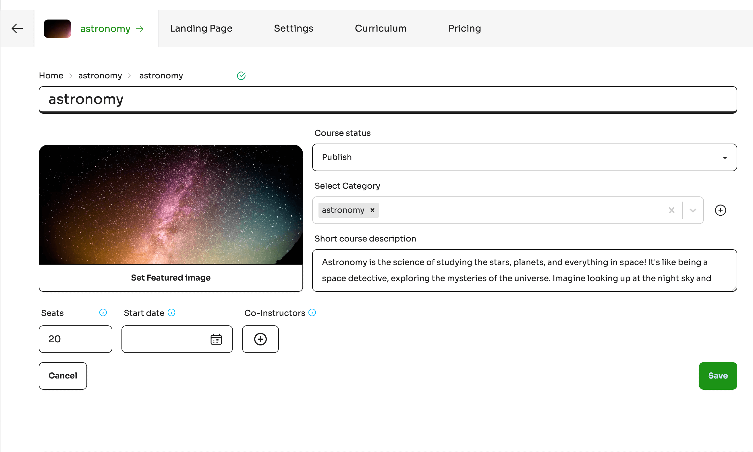 Here you specify the course title, a short course description, a featured image, a status of the course [ if this is live immediately, coming soon or in draft status] then you can select course category or create a new category to which the course will be assigned to.