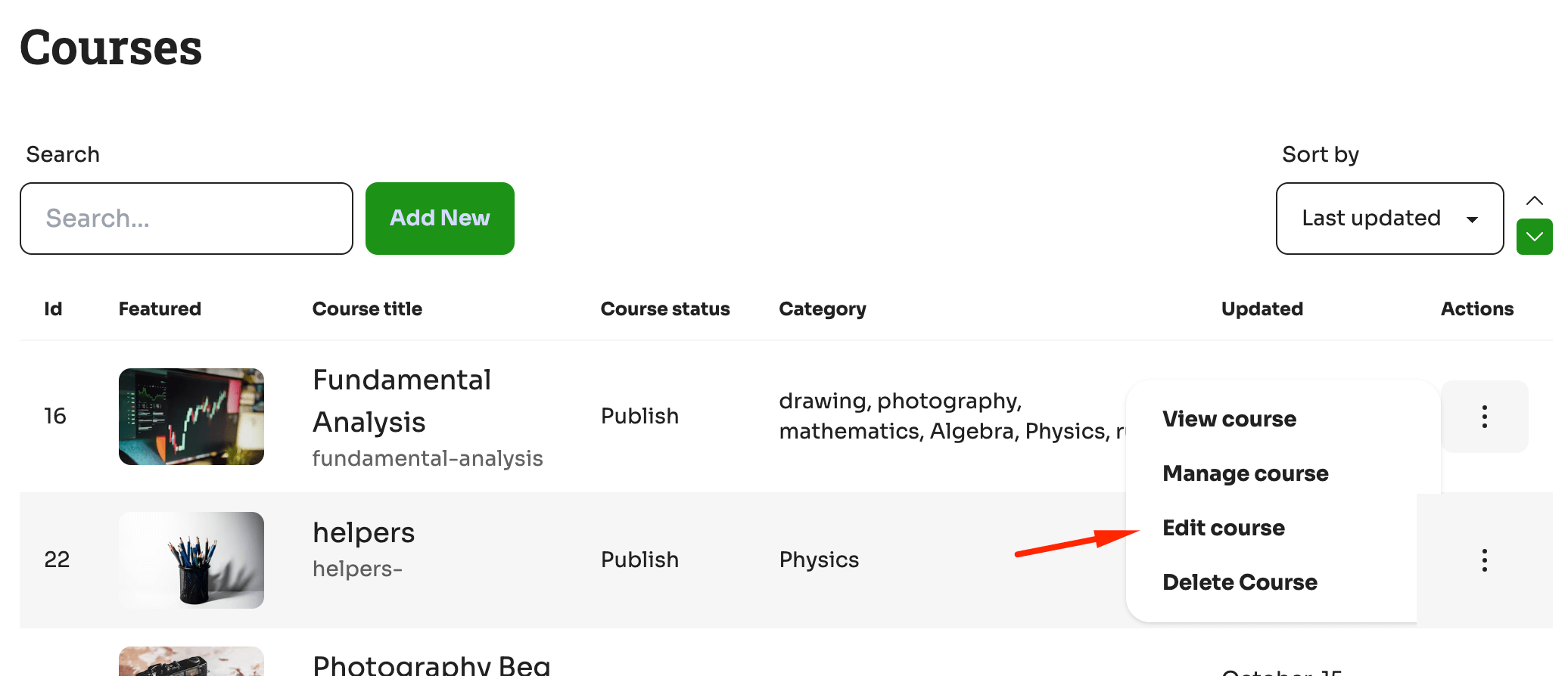 Now you have to Edit the Course . To edit the course , locate the course and from menu panel select Edit.